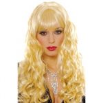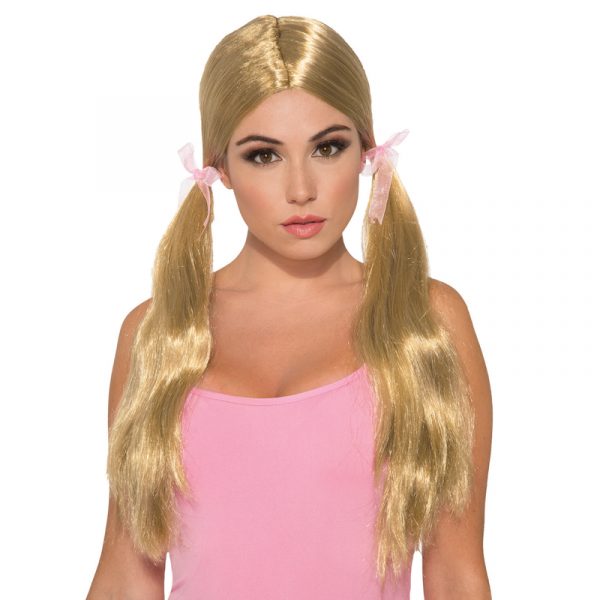 Pigtail Patty Wig comes in blonde and black. The pigtail’s are tied off with pink organza ribbons.