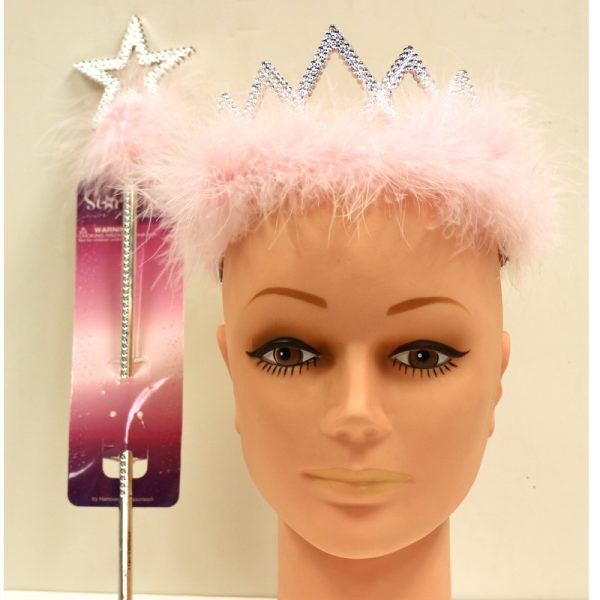 Perfect for a princess this Plated Plastic Diamond Tiara with Star Wand Set features Pink Marabou! It looks great on adults and children! Wear as part of a Halloween Costume or to accessorize a beautiful ball gown.