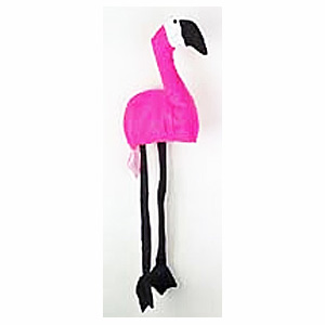 This hot pink Flamingo Hat is really cute and funny! The body is really bright pink fabric (almost Neon Pink). The head is black and white. The legs and feet are solid black and dangle down the sides of your head. There is even a little pink tail at the back.
