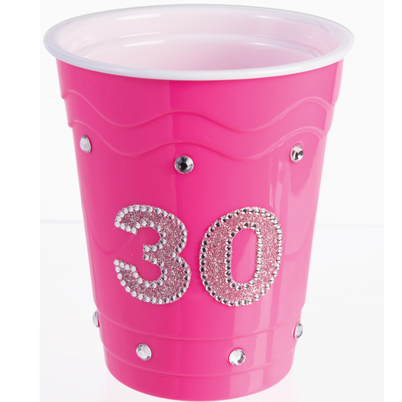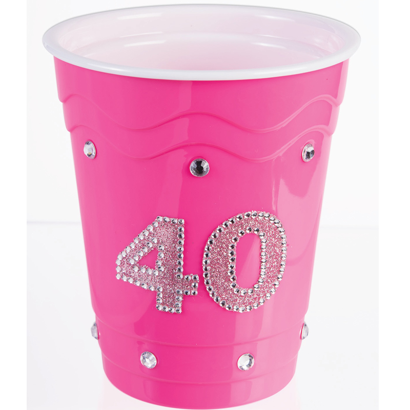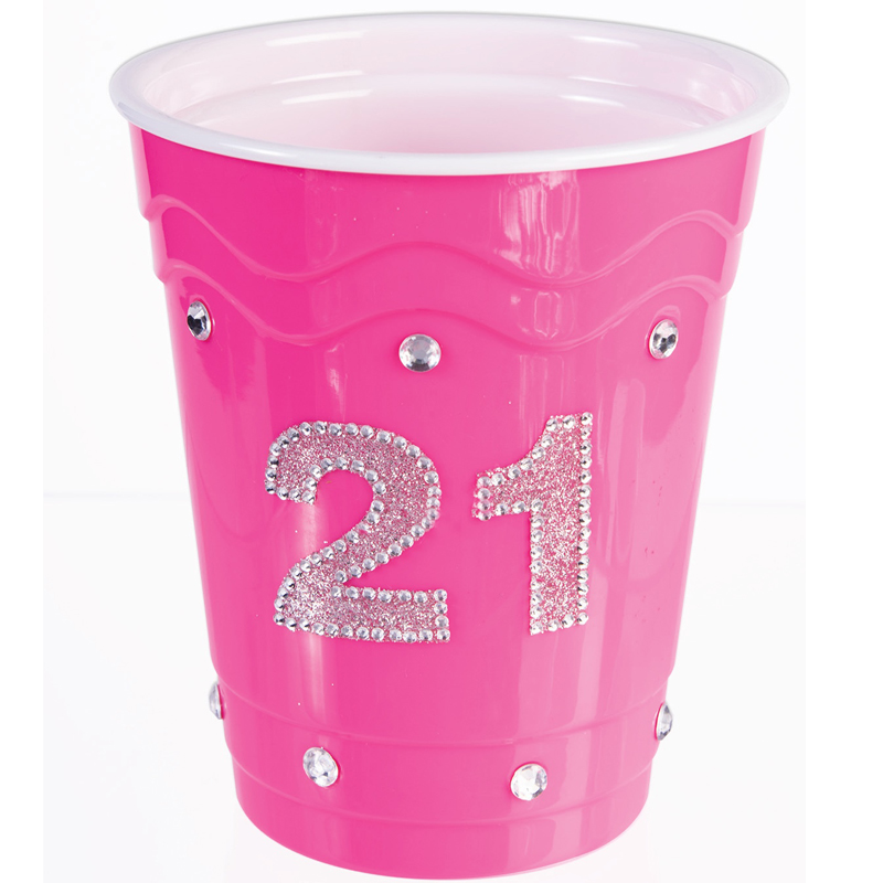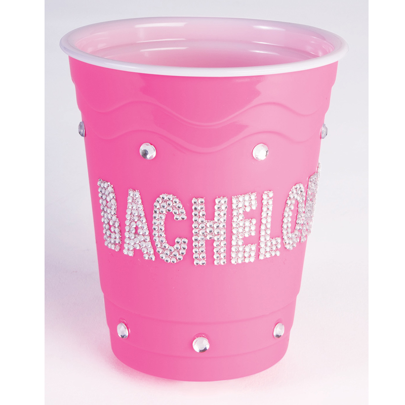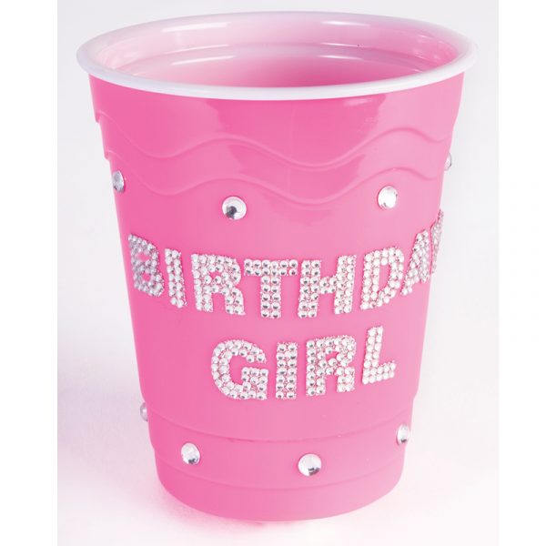 Pink Hard Plastic Rhinestone Cup. This is way better than a red solo cup! This is not a flimsy cup. It is something you can hold onto and it holds approximately 12 fluid ounces.