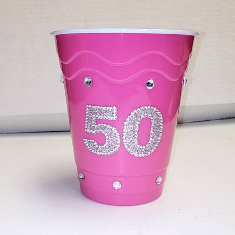 Pink Plastic Party Cup w Clear Rhinestones is the perfect party accessory to celebrate turning 50! This cup holds 16 ounces of liquid goodness, or use it to put in their favorite candy, or in a gift basket.