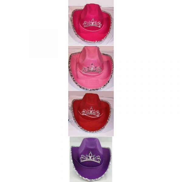 Wear Sequin Trim Cowgirl Hat with Tiara to dress up your western look. We think you’ll love the look! Show up and show off your flashy style. They come in 4 different colors, all with silver trim and tiara.