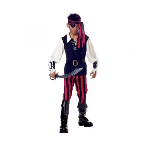 Steal the hearts of party guests with Pirate Cutthroat Child Costume. Board the party ship and have a grrr-eat time! The Cutthroat Pirate child costume comes with black and white shirt, pants, belt, boot tops, wrist cuffs, and head tie. Sword, eye patch, shoes not included. Buy this for Halloween, themed parties throughout the year, cosplay, school plays, and more. It is available in 3 child sizes.