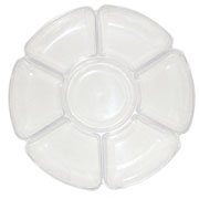 This clear round diamond-cut, plastic, 7-section Serving Tray is 16″ round and features 7 sections or compartments. Perfect for using as a fruit or veggie tray