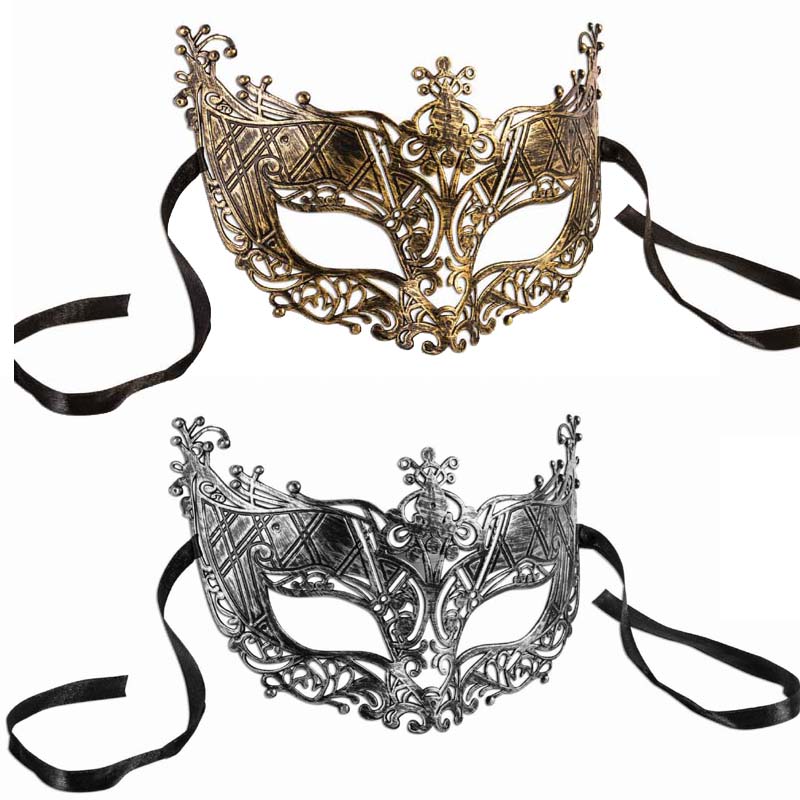 Choose from silver or gold! Wear a Plastic Filigree Half Mask to your next Halloween party or any masquerade themed event. Mask features black ribbon ties to hold it in place.