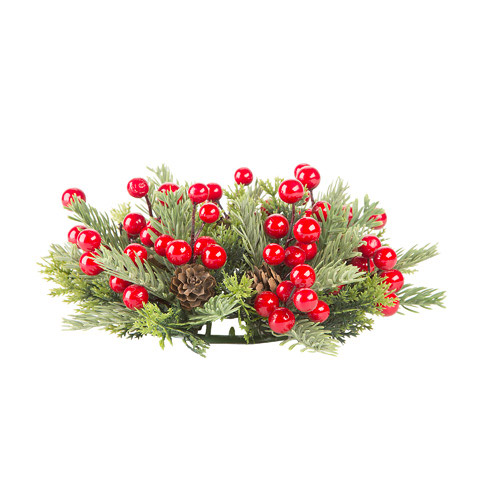Enjoy this Plastic Foliage Candle Ring with Pine Cones & Berries all through the season! This attractive candle ring features bright red berries and small brown pine cones.