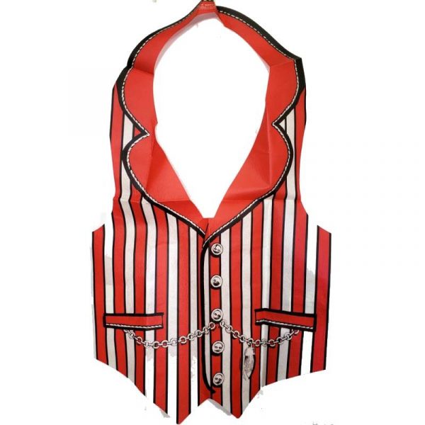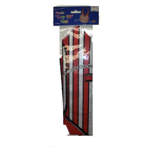 Plastic “Gay 90” Vest is a great costume starter. It is red, white and black striped and water resistant. One size fits most. This vest makes a great 1890’s party decoration or can be worn for casino nights.