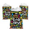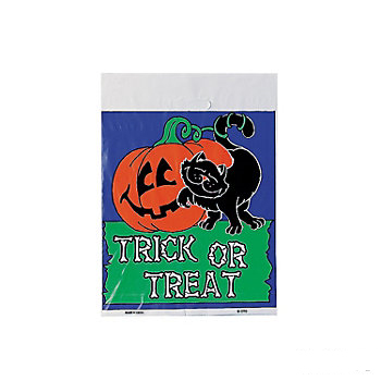 13″ – 17″ Plastic Halloween Trick or Treat Bag comes in 2 different designs: one has a black cat rubbing up on a pumpkin and the other has candies scattered around “TRICK OR TREAT” in white lettering.