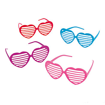Heart shaped shutter shade eyeglasses are available in four colors: Pink, Red, Blue, and Purple. These plastic eyeglasses are sized to fit most adults. It is surprisingly easy to see out when you are wearing them.