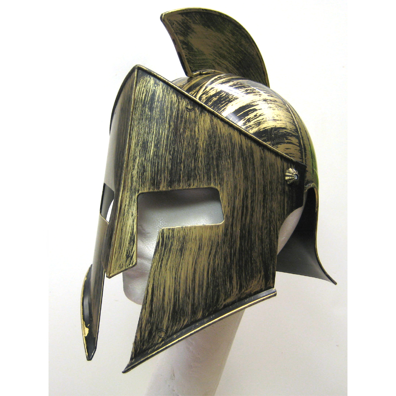 Plastic Medieval Iron Knight Helmet. Golden with a moveable face mask that moves up to show your face and down to hide it. It’s gold with black streaks to give it that nice Medieval look.