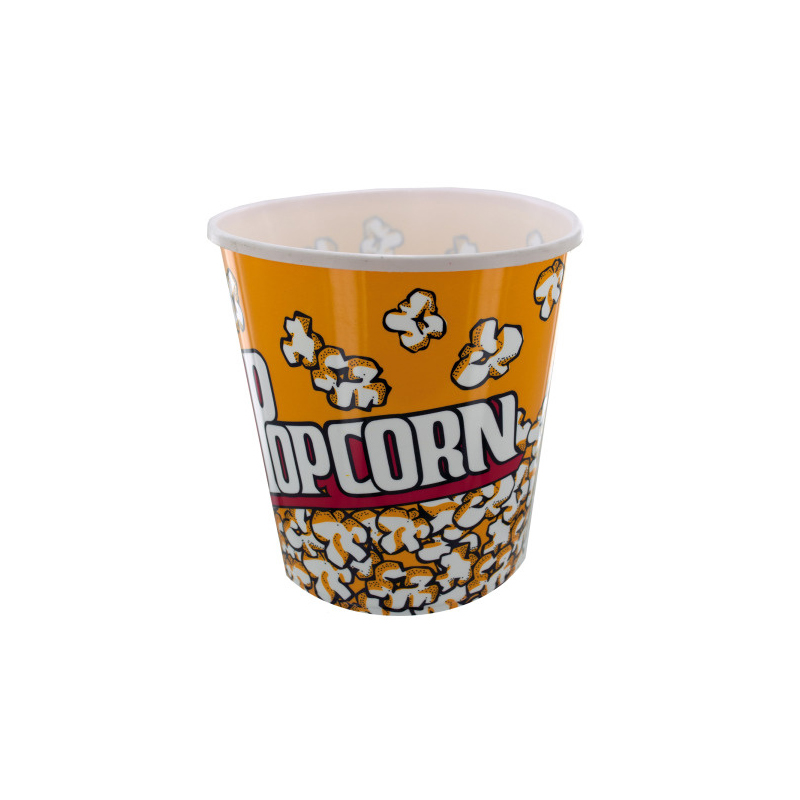 Plastic Popcorn Bucket measures about 8″ high. At the bottom the bucket measures about 5″ and at the top 7.5″. “POPCORN” is written diagonally in white lettering with popcorn falling from the top and gathering around the bottom.