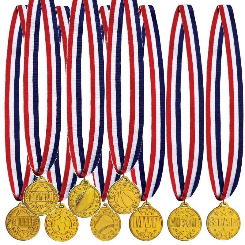 Choose from 9 medals to award each member of your team. Each lightweight 2″ gold medal hangs on a 30″ tri-color red, white, and blue ribbon or lanyard.