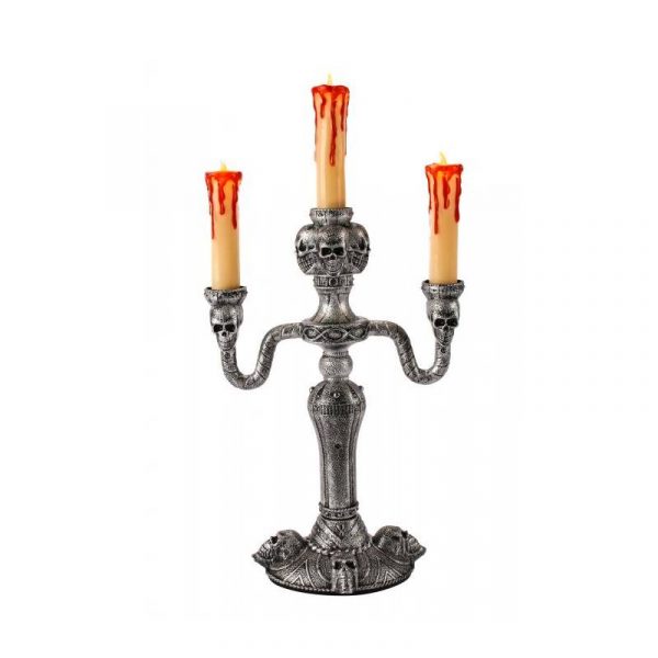 Decorate for Halloween or a seance with this 14″ Plastic Skull Candelabra w LED Bulbs. Off-white candles feature red drips and flickering yellow LED lights.