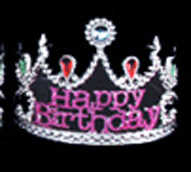 This tiara is silver. Each point has either a star or gem. There is a large gem on the tallest point of the tiara. Child sized.