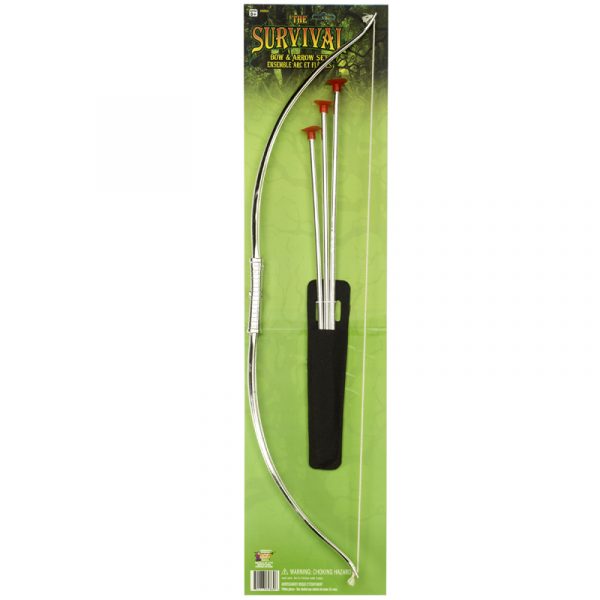 This silver plastic bow, arrow and knife set has a black plastic quiver and 3 arrows with orange suction cup tips.