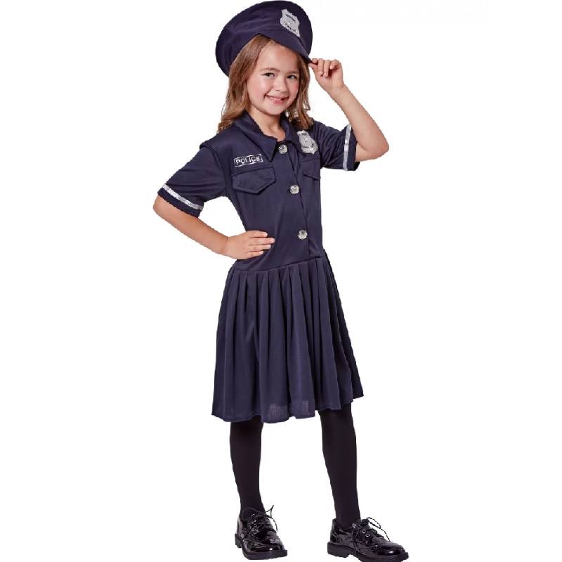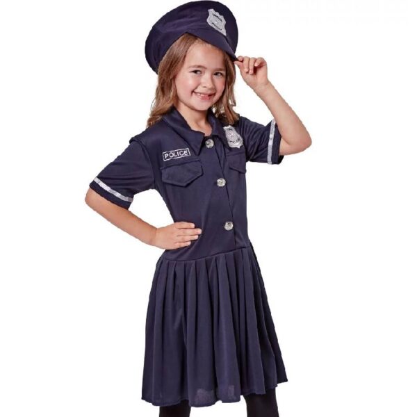 The police girl dress is a classic child’s costume that exudes authority and power. It’s a dress that features a black top with a high collar and a button-down front. The short sleeves are adorned with gold stripes and a police badge, while the attached black skirt falls just above the knee. The dress is completed with a black belt and a police hat. The overall look is sleek and professional, making it a perfect choice for Halloween parties, cosplay events, or theatrical performances. It’s a great way to channel your inner law enforcer and show off your commanding presence. Dress is available in size Medium and Small.