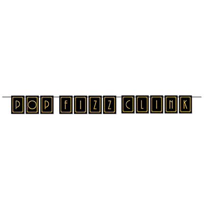 Pop, Fizz, Clink Streamer is printed on one side. Pennants are hung on a black string. The banner is 12′ long with the pennants measuring 4.5″ x 6.25″. Assembly required.
