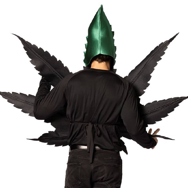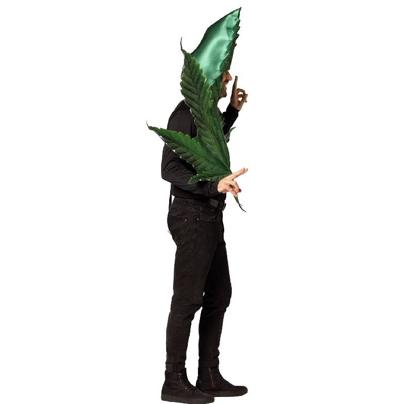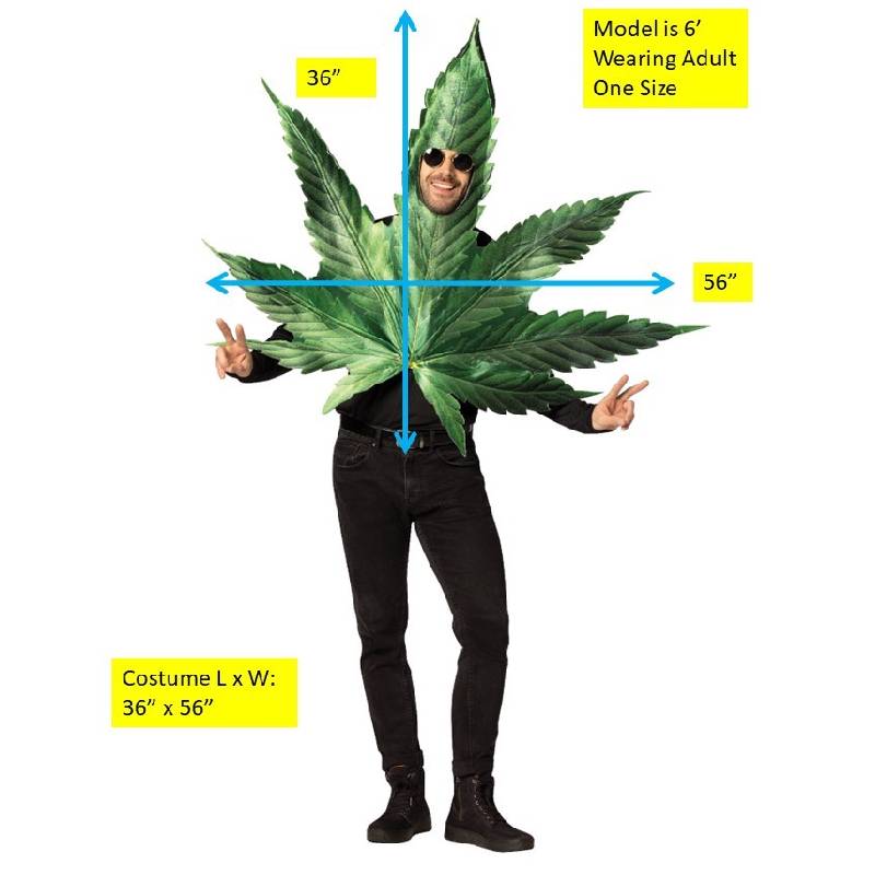Pot Leaf Adult Costume includes a head in tunic with an open face and arm openings for easy eating and drinking. The front has a photorealistic print of a pot leaf. Sunglasses, pants and shirt are not included. This costume is a one size and fits most adults. Spot cleaning with cold water only. Do not wash, bleach, dry clean or iron. Easy wear & care! 100% Polyester. This is a great costume for college parties, festivals, Halloween, themed parties, theatrical productions, and more!