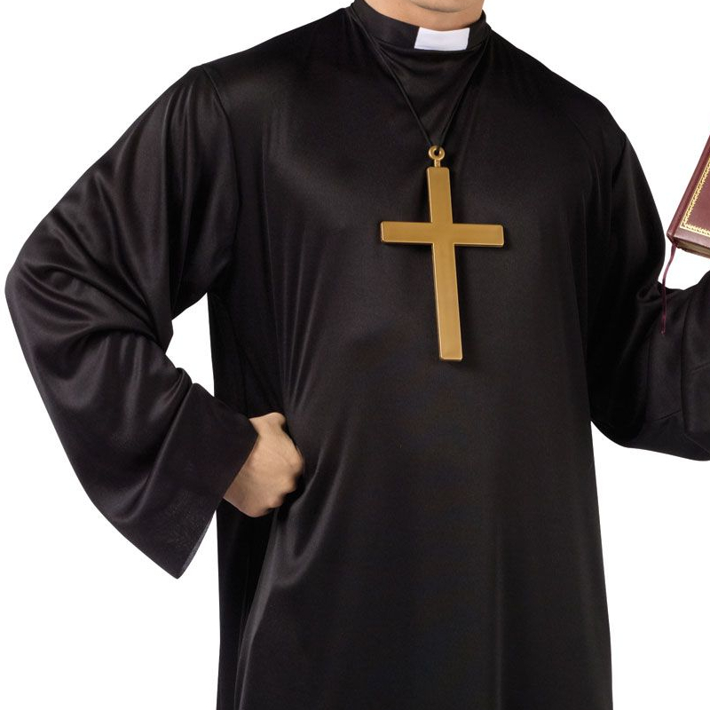 Priest Adult Size Costume is a fast and easy costume idea! This costume features a black, knit poly, pull-over robe. It is full length with long sleeves that slightly bell at the end. It includes an attached white tab inset on the collar. The robe has an easy ribbon tie in the back.