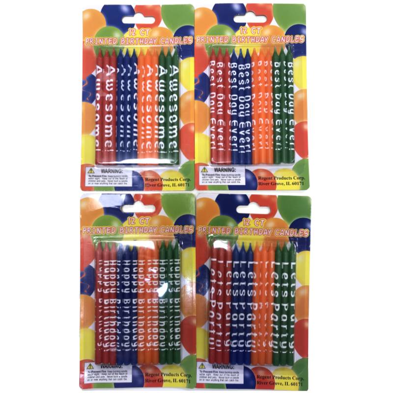 Decorate your cake top with Printed Birthday Candles w Phrases. 12 candles in 4 different colors will add vibrancy to the flame.