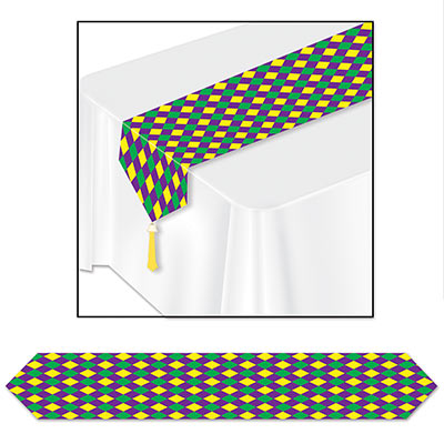 Printed Mardi Gras table runner. Jazz up the tables at your Mardi Gras celebration by dressing them with this Printed Mardi Gras Table Runner. It measures 11 inches wide by 72 inches long. Comes one table runner per package.