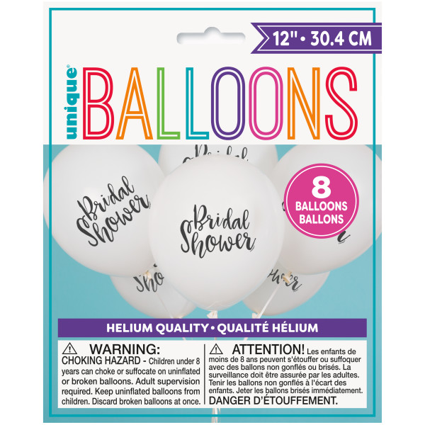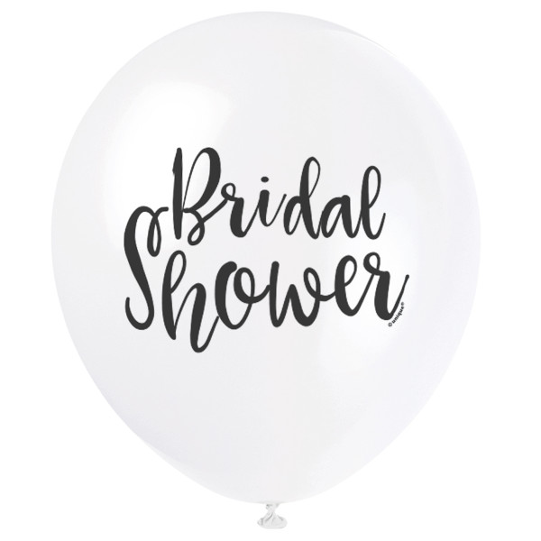 Having a bridal shower? Decorate any space with these pretty round bridal shower latex, helium-quality balloons. 8 per package. Feature Bridal Shower in black script!