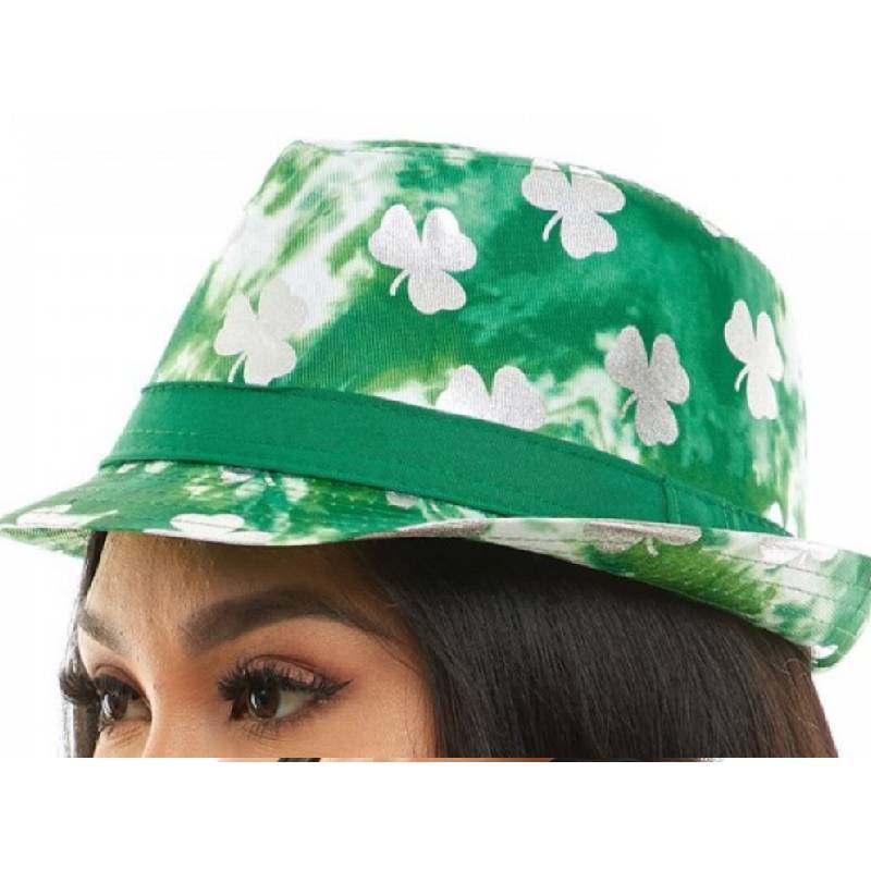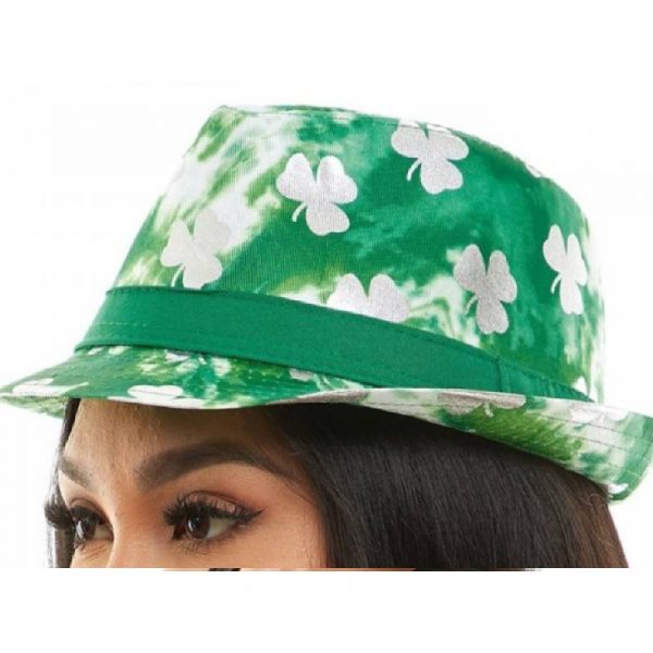 - Decoration: Besides the printed shamrocks, the hat has additional decorative elements like a ribbon hatband and shades of green and white throughout the whole hat.