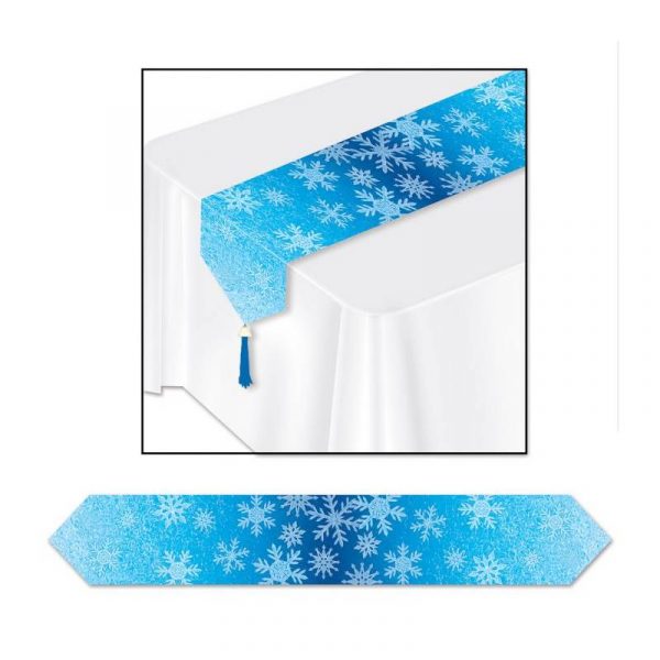 Printed Snowflakes Table Runner will be a beautiful addition to your holiday decor. Make this part of your winter-themed party decorations. Place this on the dinner table. Use this at public events to accent the refreshments table. Blue tassels tie up the ends on either side. It measures 11″ x 6′ allowing plenty of length to fit most tables.