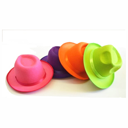 Need a Fedora in a great hot color? Here’s your hat. Each is made of pressed felt, has a satin band and has poly trim around the brim.