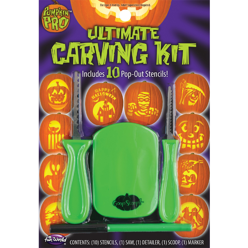 Pumpkin Carving Kit includes 10 pop-out Jack O lantern Stencils, 1 saw, 1 detailer, 1 scoop, 1 marker.