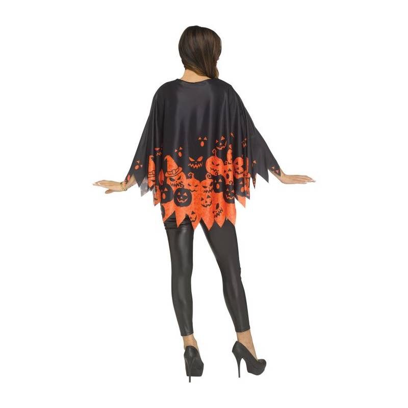 Wear this beautiful Pumpkin Poncho for an easy, comfortable Halloween Costume. Pullover poncho with printed pattern leaves hands free! One Size fits most adults.
