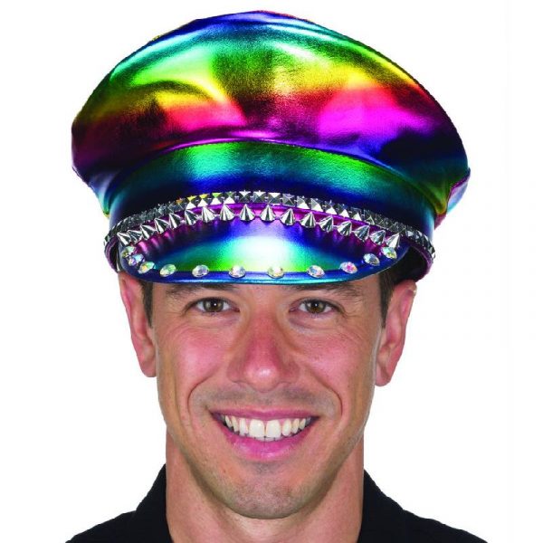 Wear this Rainbow Fabric Military Cap w Studs & Jewels to the next Burning Man event or fundraiser! This lined captain’s hat features a jeweled design on front and shiny metallic rainbow fabric.