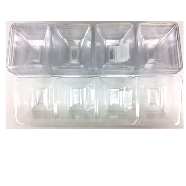 Serve up 4 different foods in this 4 compartment tray. Measures 5″ X 16″. Made of clear plastic. Perfect way to serve relish on a buffet table!