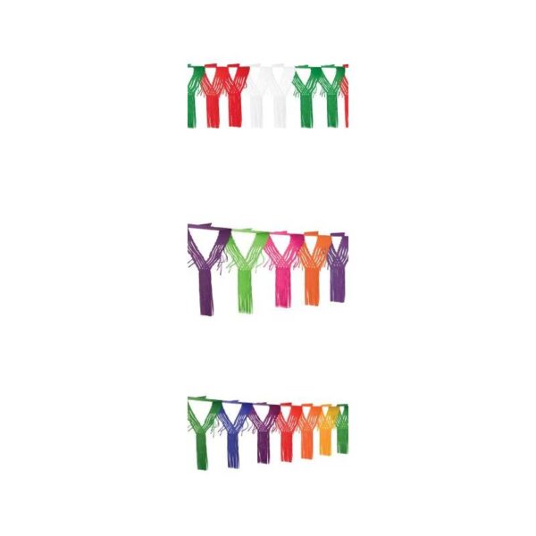 Drop Fringe Garland comes in 3 different colors. Red/White/Green are the colors of the Mexican and the Italian flags and can be used for both. There is also a rainbow garland and multicolor. They are all brightly colored and will cheer up any party or classroom. The fringe brings the garland to life.