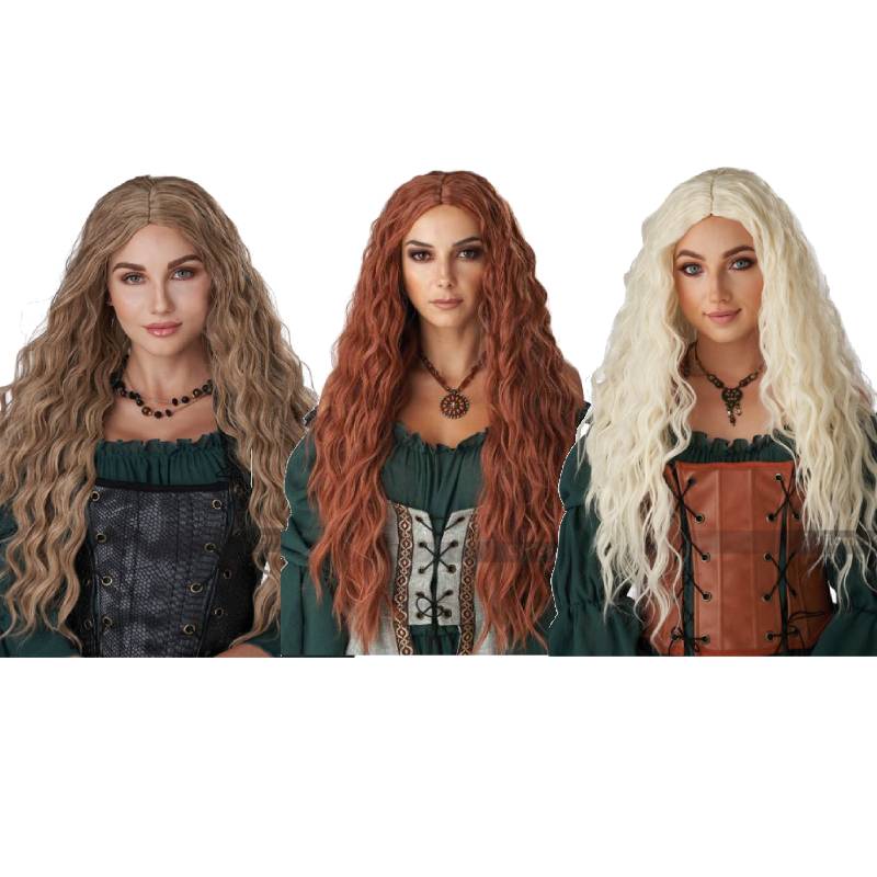The Renaissance Maiden Wig in light blonde, auburn, or dirty blonde is a long length wavy wig with parted bangs tied back into a pony tail.