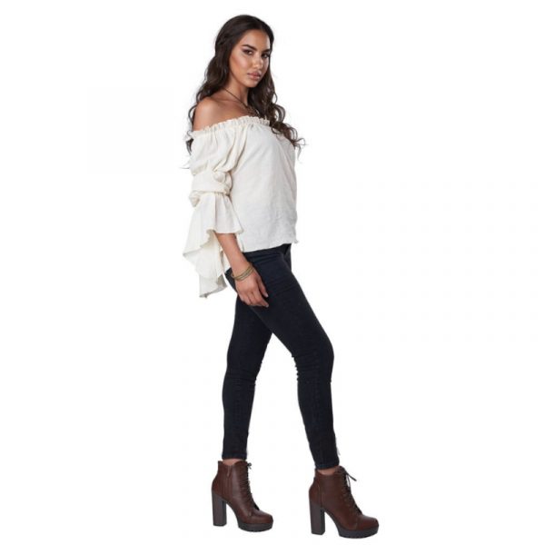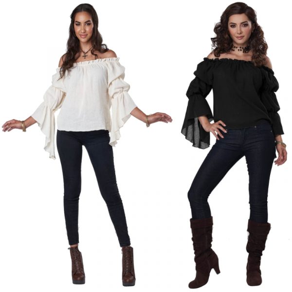 Renaissance Peasant Blouse Adult Size comes in 2 colors, either black or cream. This blouse has ruched sleeves. It features an elastic neckline and is made of a fabric with a medium course looking texture weave. Wear this for Halloween, to renaissance fairs, pirate themed parties, cosplay, plays, productions, other themed parties or create your own unique style. This blouse gathers together at two different places around both arms. The sleeves cascade down to about the hips. Wear this with a simple pair of jeans or use it to create an elaborate costume. This style compliments most body types. Feel comfortable and confident in this Renaissance Peasant Blouse.