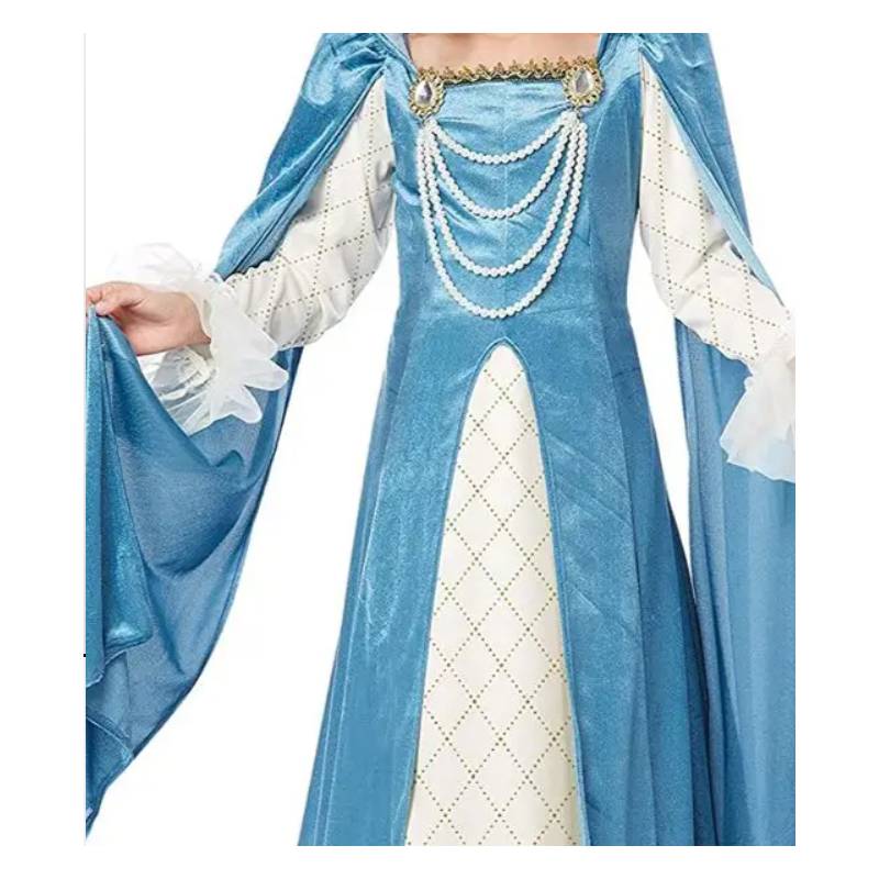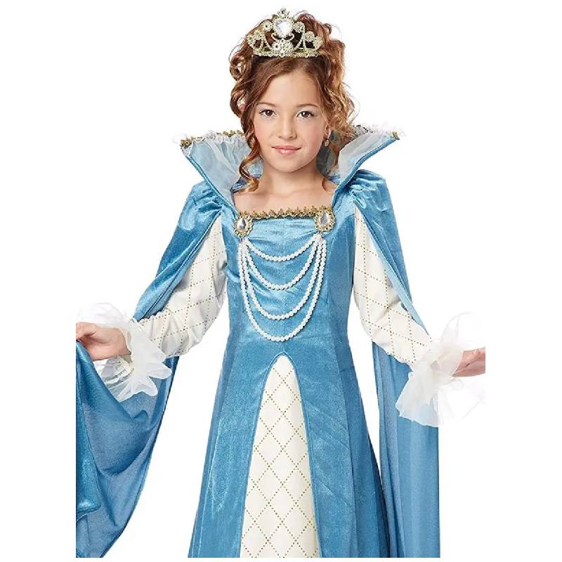 Renaissance Queen Child Costume is a rich reminder of how elite women of the middle ages dressed. This elegant costume is perfect for Halloween, theatrical productions, reenactments, cosplay, school plays, themed parties, birthday parties and more. Your queen costume is designed to slip on over your head. It has a royal collar attached. The pearl necklaces are detachable.