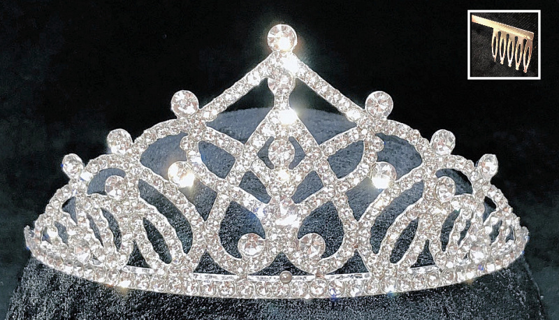 Look beautiful in this Rhinestone Tiara style # 260! The tiara is approximately 2.25″ high. It sits on a sleek silver-plated metal frame. It has 2 metal combs attached to the ends. This is perfect for prom or wedding hair-do’s. Buy this for birthdays, Halloween, wedding day, prom or homecoming, beauty pageants, and other special occasions.