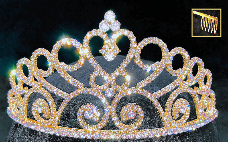 Look beautiful in this Rhinestone Tiara style # 265! The tiara is approximately 2.5″ high. It sits on a plated golden metal frame and has 2 metal combs attached to the ends. This is perfect for prom or wedding hair-do’s. Buy this for birthdays, Halloween, wedding day, prom or homecoming, beauty pageants, and other special occasions.
