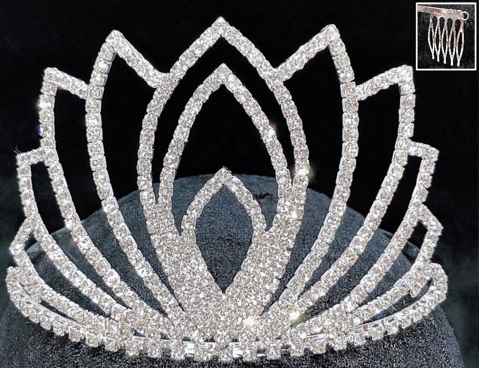 Look beautiful in this Rhinestone Tiara style # 266! The tiara is approximately 3.25″ high. It sits on a sleek silver-plated metal frame. It has 2 metal combs attached to the ends. This is perfect for prom or wedding hair-do’s. Buy this for birthdays, Halloween, wedding day, prom or homecoming, beauty pageants, and other special occasions.