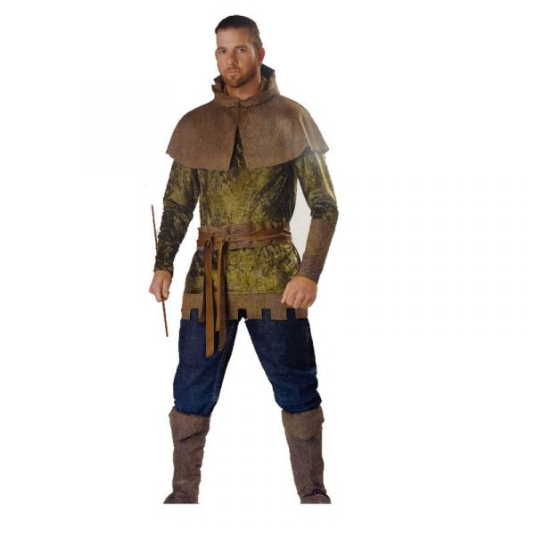 The costume begins with a tunic of earthy green, reminiscent of the canopy of trees that shelters Robin and his band of merry outlaws. Embroidered with intricate patterns and trimmed with touches of gold, the tunic exudes an air of both elegance and rugged charm. Over this, the iconic hooded cloak of deep forest green is worn, its flowing fabric providing both camouflage and a sense of mystique.
