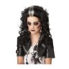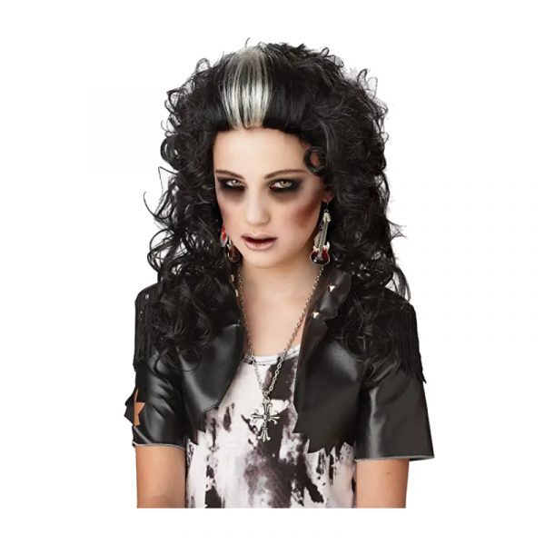 Rocked Out Zombie Wig is slicked back in the front with a gray streak. The wig then has curls flowing down to just below the shoulders.