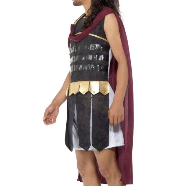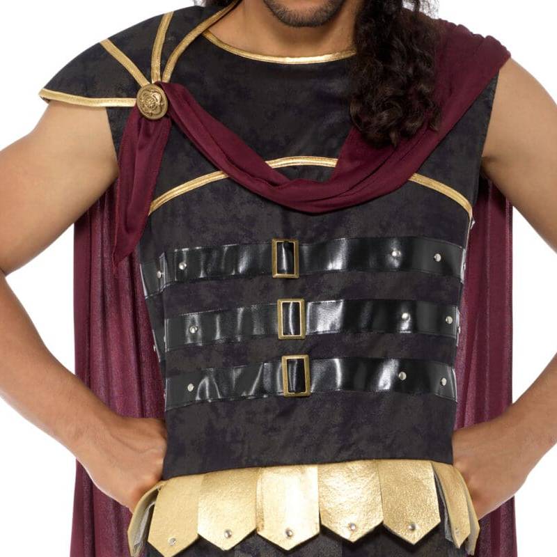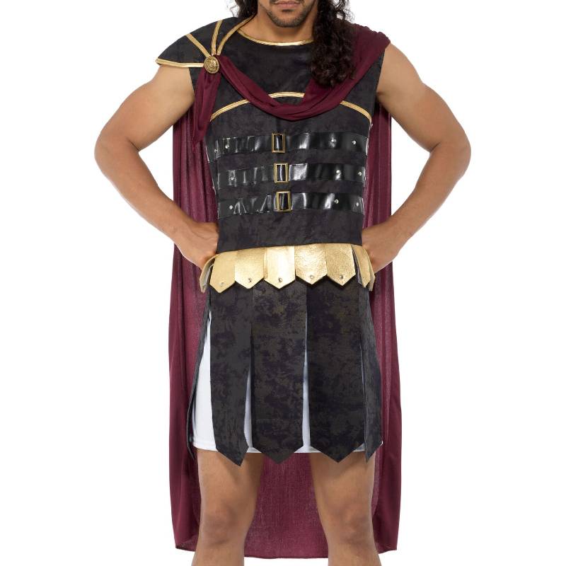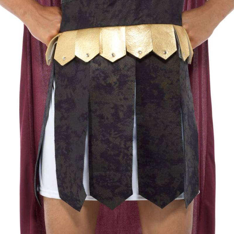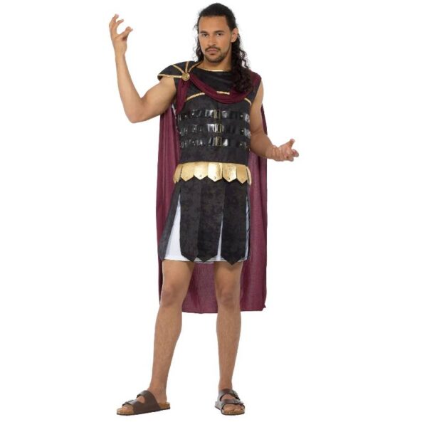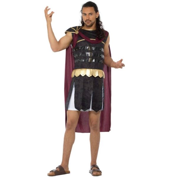 The Roman soldier adult costume with a red cape is a classic representation of the military attire worn by soldiers of the ancient Roman Empire. Here’s a detailed description: