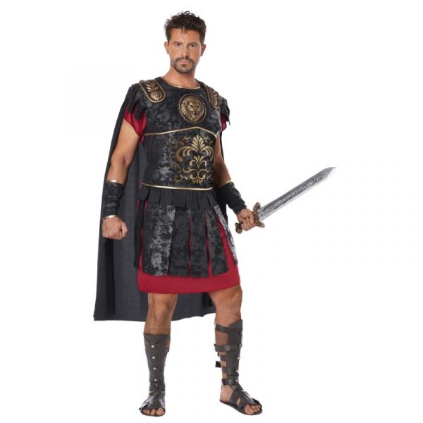 Roman Warrior Adult Costume. The Empire’s strength is brave warriors. This costume includes a red tunic top, a black and gold “armor” with attached cape, two stick on molded shoulder straps and a pair of wrist guards. The armor piece covers the front and it ties around the back with a neck and waist tie. Assert your strength and dominance as a warrior. This costume can be worn for Halloween, themed parties, cosplay, drag, plays, productions, reenactments and more. This costume is breathable and perfect for indoor or outdoor get togethers.