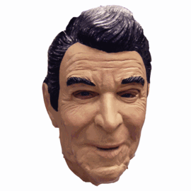 Latex Ronald Reagan political mask fits entirely over your head. Mask features the former POTUS with his style of black hair and smile wrinkles around his eyes and mouth.