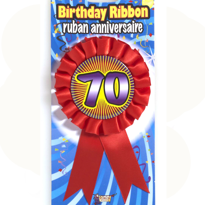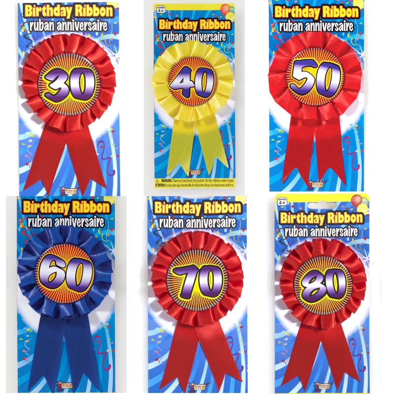 Rosette Birthday Ribbons. These Rosette Award Ribbons are approx. 6″ X 3.5″. They have a pin attached to the back. They are very well made. The button on the front is metal and they have a plastic back to which the pin is attached.