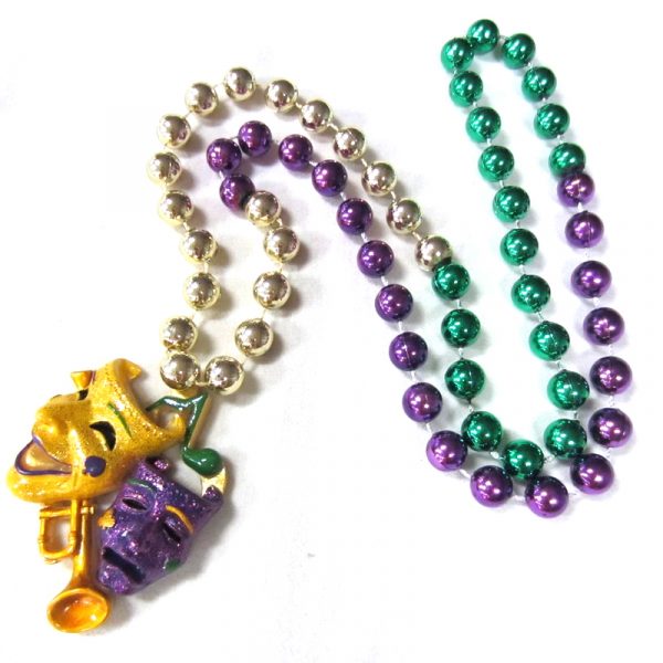 Purple, Green and Gold Round Metallic Bead Necklace with Glittered Comedy Tragedy Faces hangs about 18″ long including the medallion, 15″ without. The comedy face is gold glittered while the tragedy face is purple glittered. They are separated by a trumpet.