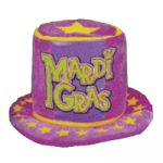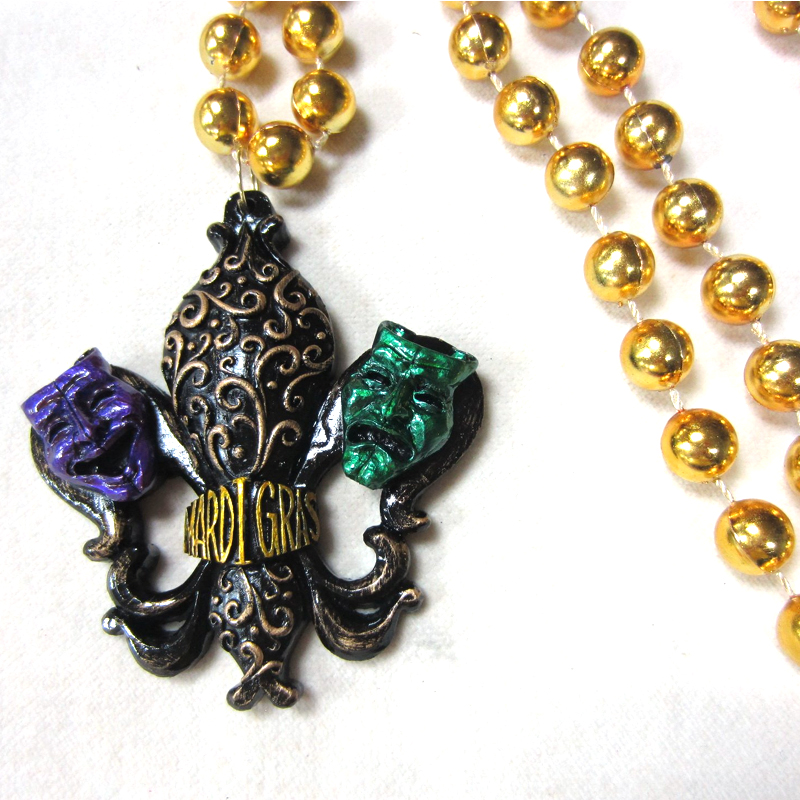 Round Metallic Gold Bead Necklace Mardi Gras Comedy Tragedy Faces hangs about 19″ with the medallion, 15″ without. A large black Fleur De Lis has gold detailing and “MARDI GRAS” written in the center. There is a purple comedy mask on the left and a green tragedy mask on the right.