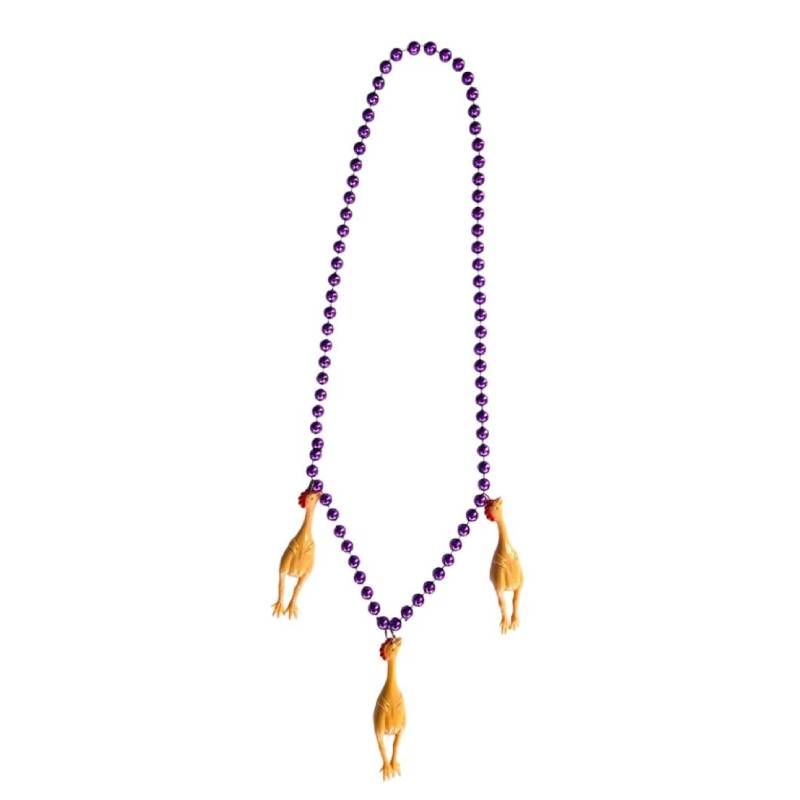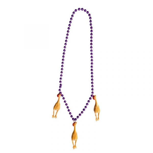 Buy this Metallic Beads with Chickens necklace is great for Halloween, Mardi Gras themed events, and more. Use this in arts and crafts projects. Buy this for gift baskets, door prizes, party favors, and more. Place them around the refreshments table as part of your décor. This is perfect for gag gifts and fun times. Rubber chickens have been around for decades and now you can wear them around your neck.