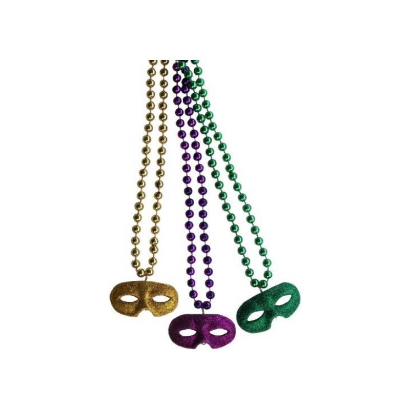 This beautiful glitter mask on a metallic bead necklace is great for Mardi Gras themed events, masquerade themed events and more. You can use this as an accessory for a Halloween costume. Use this in arts and crafts projects. Buy this for gift baskets, door prizes, party favors, and more. Place them around the refreshments table as part of your décor. This necklace is surprisingly versatile! Wear this to multiple events year round. You can wear this to office parties, house parties, themed events, and more. The masks are glittered to catch lights and bring smiles to everyone around you.
